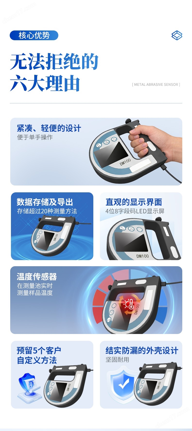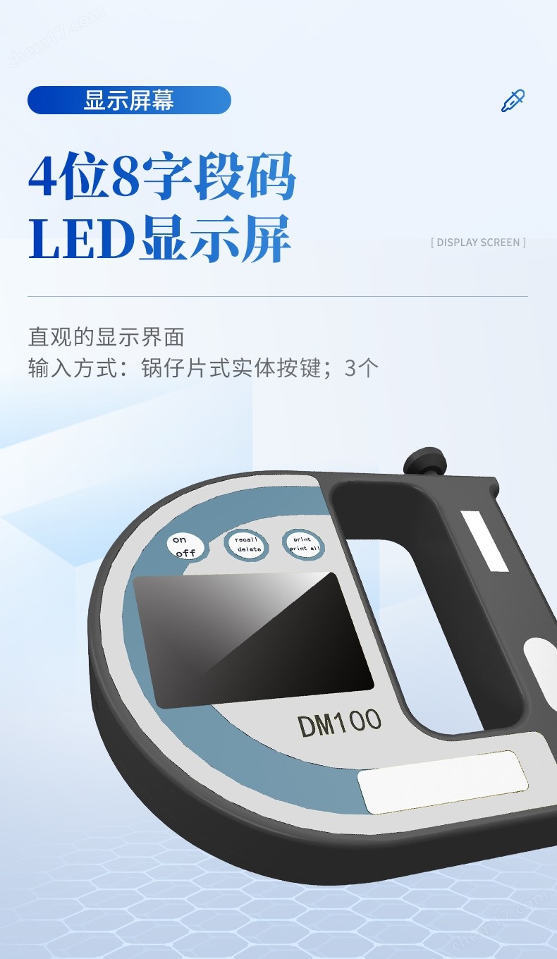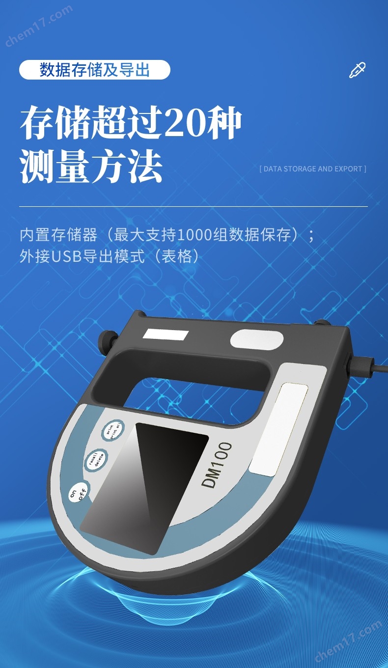 DM100是一款便攜式手持式液體密度計(jì),采用U型振蕩管測(cè)量技術(shù),進(jìn)行液體密度測(cè)量,除了以g/cm 或kg/m 為單位測(cè)量液體的密度外,還可以測(cè)量相對(duì)密度、參照溫度和濃度等其他單位。溫度傳感器可在測(cè)量池實(shí)時(shí)測(cè)量樣品溫度,并顯示在顯示屏上,同時(shí)若有需要可在內(nèi)部用于密度測(cè)量的自動(dòng)溫度補(bǔ)償。